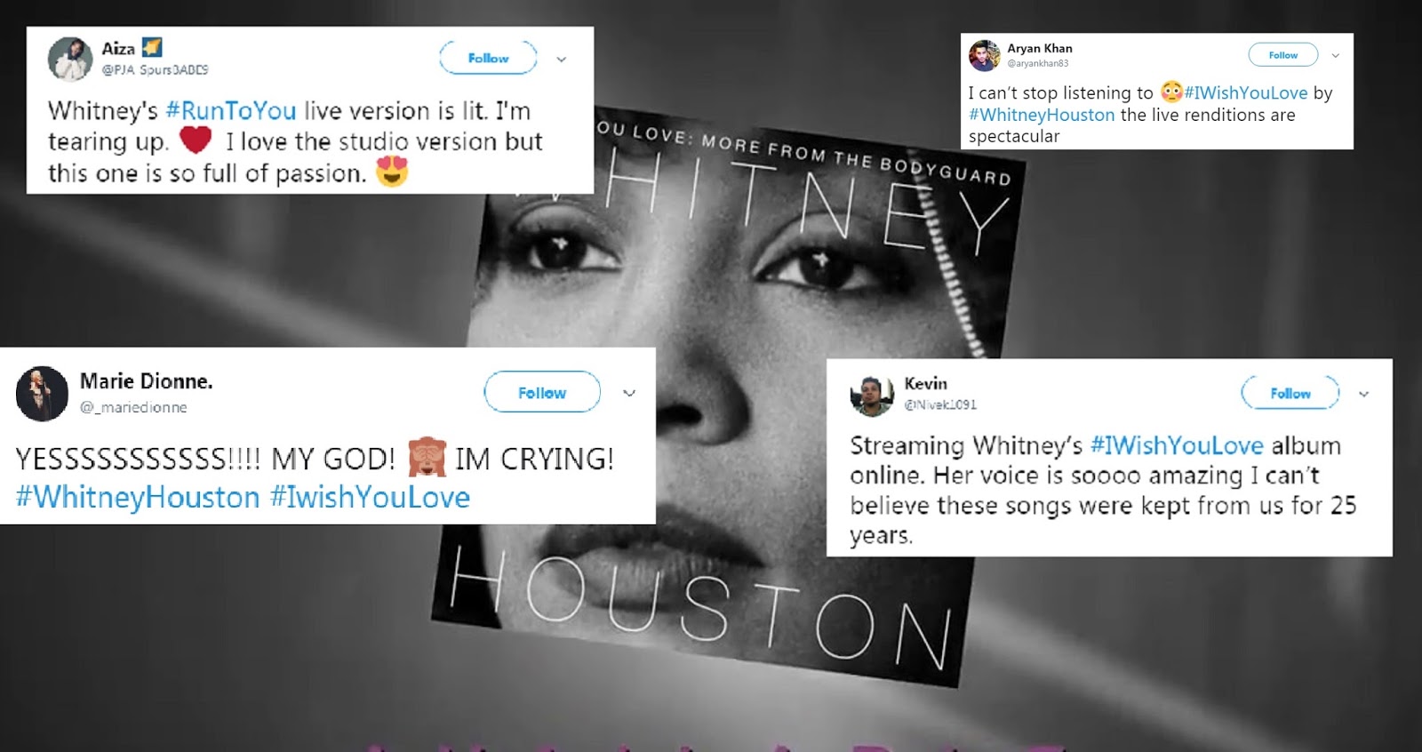 If you haven’t already purchased, do it. Reminding the world why ‘The Voice’ will never be matched. #whitneyhouston #thebodyguard #thevoice #iwishyoulove #legend pic.twitter.com/HrgZOvBLlWβ AT (@mrtzang) November 17, 2017